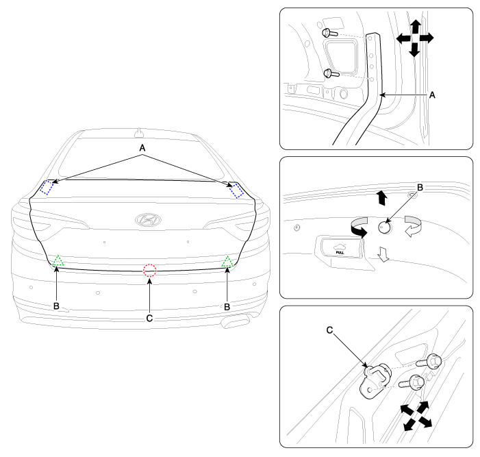 After loosening the trunk lid striker (C) mounting bolts, adjust the trunk lid striker by moving it up or down, or right or left.